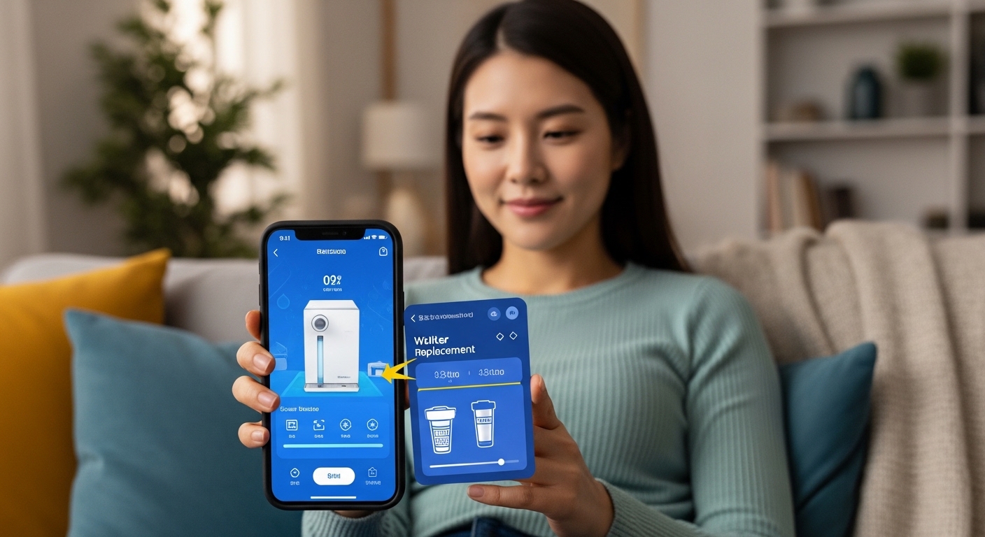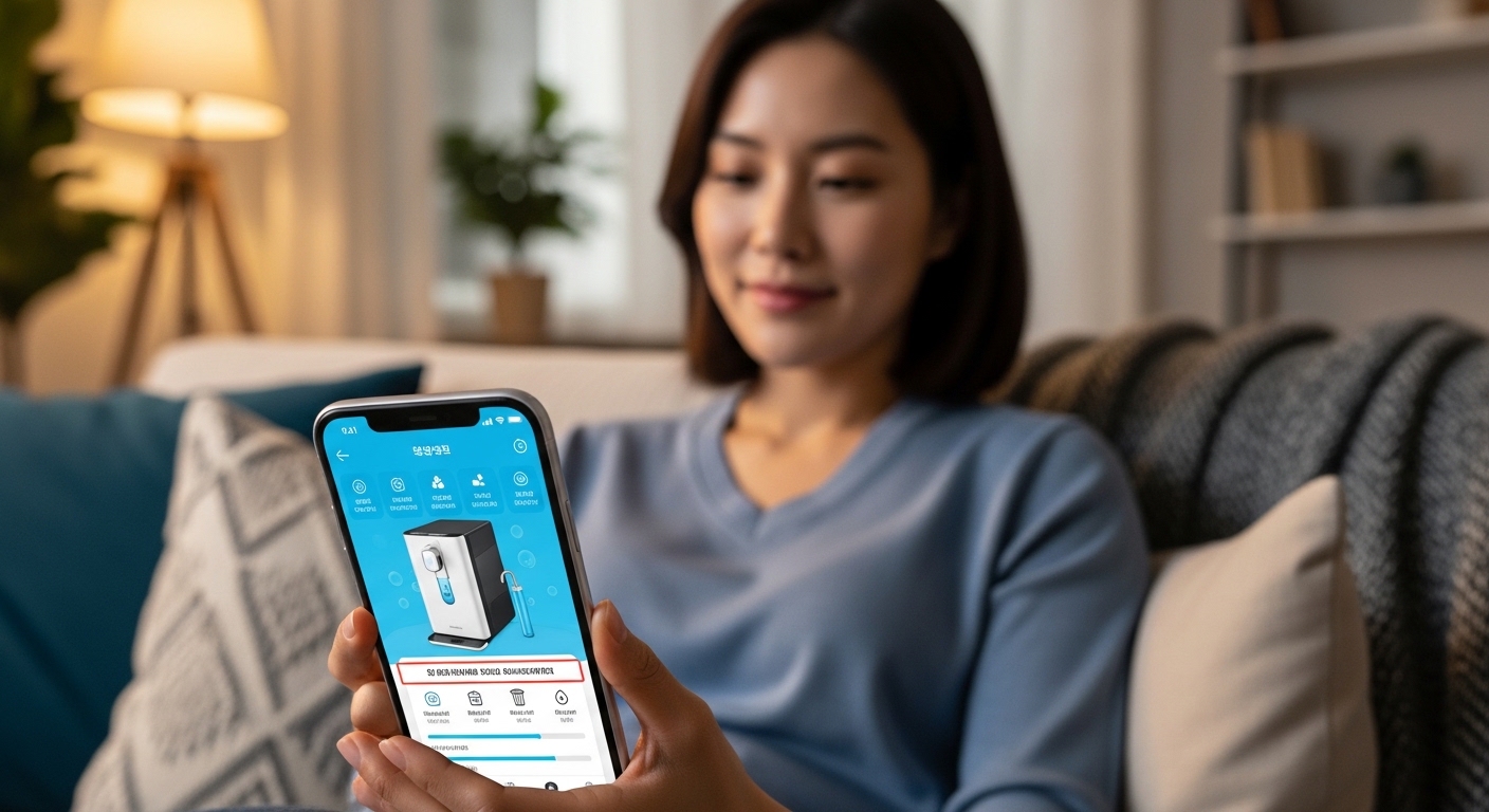 스마트폰 앱을 통해 우리 집 정수기 사용량 확인은 물론, 필터 교체 주기 알림과 방문 서비스 예약 관리를 원스톱으로 할 수 있습니다.